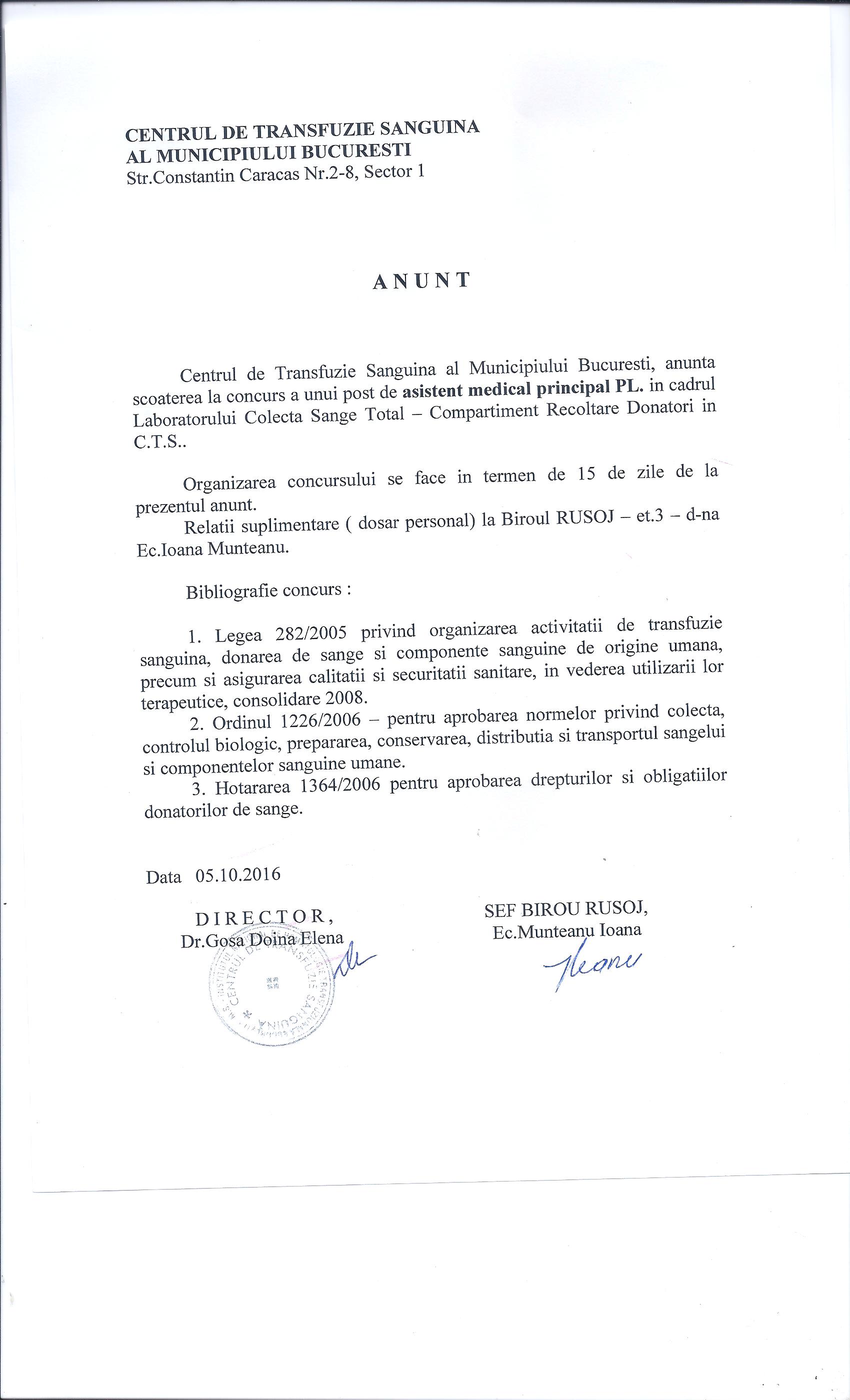 Anunt concurs post Asistent Medical Principal PL in cadrul Laborator Colectare Sange - Compart Colectare Donatori in Sediul CTS |