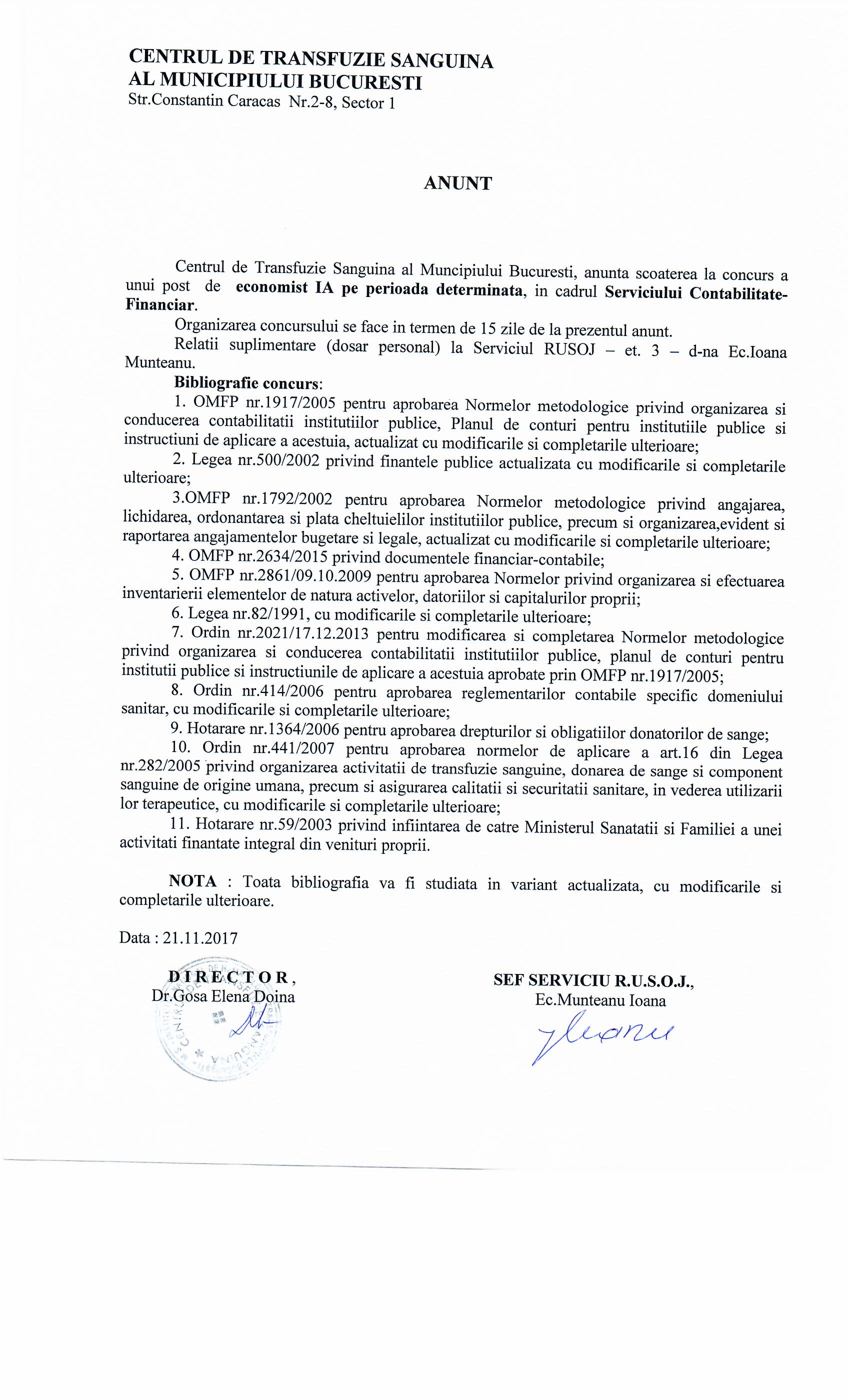 ANUNT CONCURS Pentru ocuparea unui post vacant, cu normă întreagă, pe perioadă nedeterminată, cu durata timpului de lucru de 8 ore/zi, 40 de ore pe săptămână, corespunzător funcţiei contractuale de execuţie: - Economist specialist gradul IA (S) - Compartiment Contabilitate - Financiar.