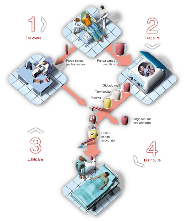 Fiecare punga de sange recoltata este transportata pe o platforma tehnica, unde sunt pregatite si prelucrate produsele din sange, prin filtrare (indepartarea leucocitelor), centrifugare si separare, obtinandu-se in final componentele sanguine: globule rosii, plasma si trombocite (plachete). Unui pacient care are nevoie de o anumita componenta a sangelui, nu i se va transfuza sange total, ci numai acea componenta de care are nevoie.